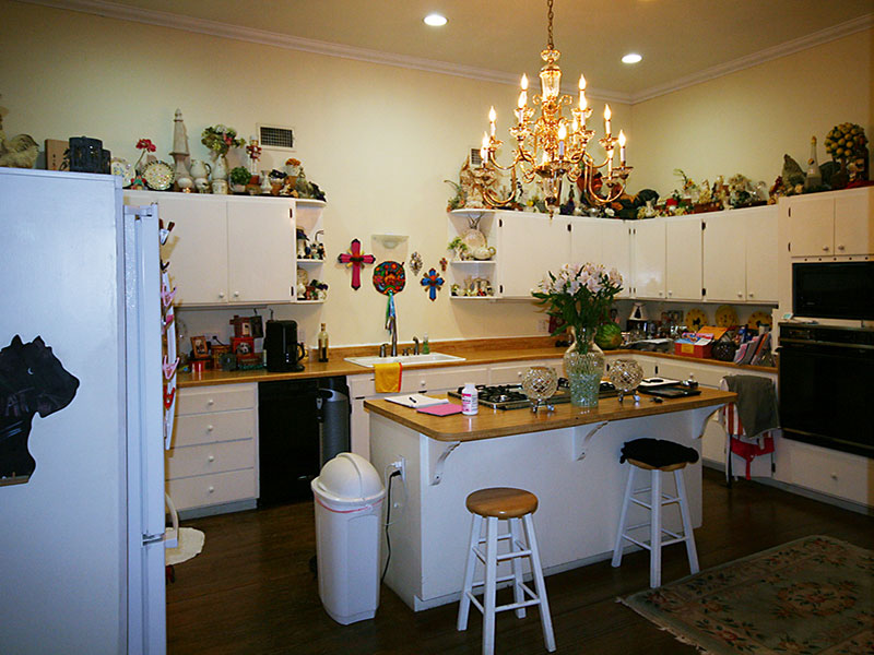 Here we transformed an outdated, cumbersome kitchen into a fresh new work environment, featuring Spanish accents with spicy colored tile backsplash; efficient, accessible cabinetry; granite counter tops; under cabinet lighting; and beautiful new hardwood floors.