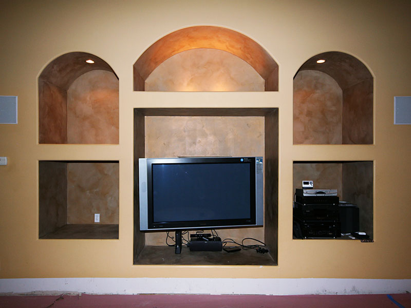 This project encompassed a complete demolition of the old entertainment center to make room for a sensational new TV Niche with recessed, remote-controlled television display and sound system with invisible low-voltage equipment. Wood cabinetry and trim were custom designed, fabricated and installed.