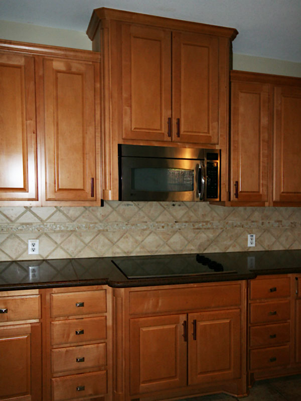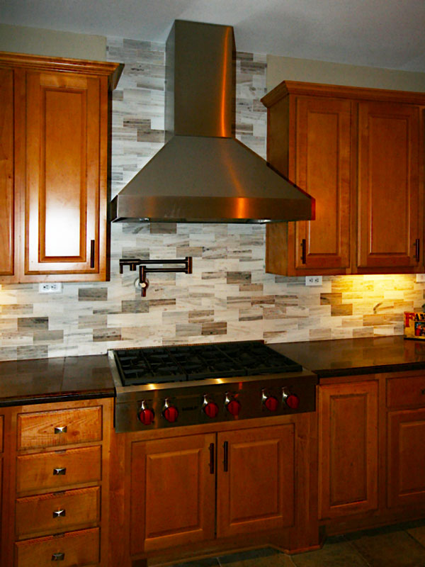 Cooktops were converted from electric to gas, a challenging process in many cases. Backsplash was refinished with stylish stone selected by the homeowners. And a Potfiller was installed in one of the kitchens (view images left).